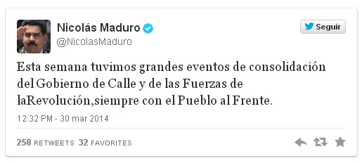 30 Mar. 2014 - El presidente de la República Bolivariana de Venezuela, Nicolás Maduro, resaltó que los eventos impulsados por la Revolución durante esta semana siguen consolidando el Gobierno de Calle y las fuerzas del proceso político nacional.