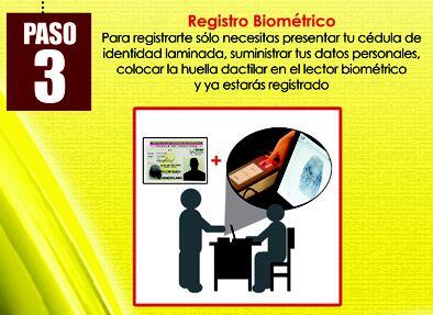 Paso 3: Regístrate. Presenta tu Cédula de Identidad, suministra tus datos y coloca tu huella en el lector biométrico.