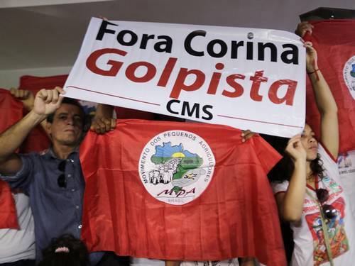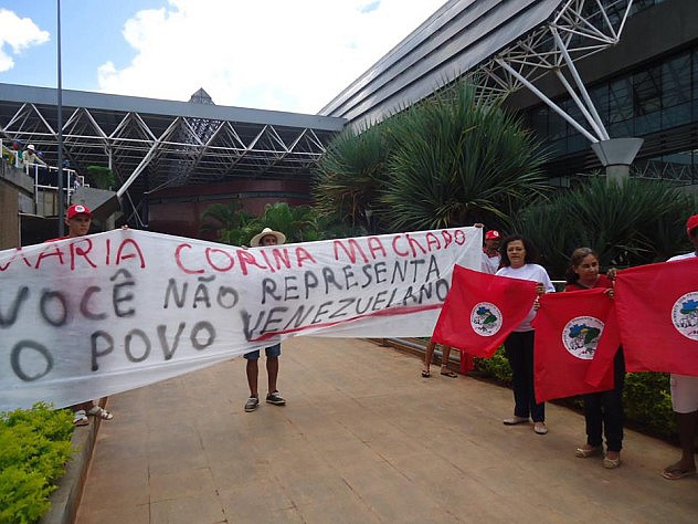 4 abril 2014 - Miembros del Movimiento de Pequeños Agricultores de Brasil protestaron este miércoles con una pancarta con la frase “Fuera Corina, ¡Golpista!” durante el discurso de la ex diputada opositora venezolana María Corina Machado en una reunión en el Comité de Relaciones Exteriores del Senado Brasileño, en Brasilia, este 2 de abril de 2014.