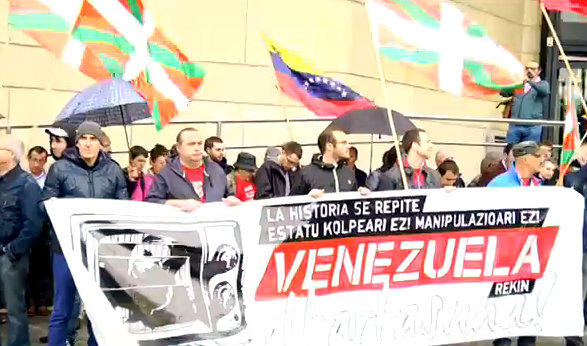 11 abril 2014 - El 10 de abril de 2014, en la ciudad vasca de Bilbao, frente a la sede donde se ubican medios de comunicación como la Radio Televisión pública vasca EITB, o las delegaciones del periódico El Mundo y las televisiones Antena 3 y La Sexta, un centenar de personas se concentró bajo el lema "Historia errepikatzen da. Estatu kolpeari ez!. Manipulazioari ez! Venezuelarekin elkartasuna!" ("La historia se repite en Venezuela. No al golpe de Estado, no a la manipulación. Solidaridad con Venezuela!").