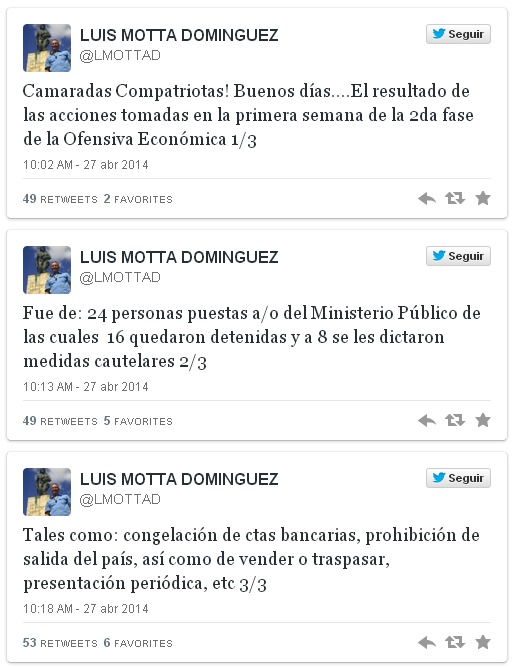28de abril de 2014.- El intendente de precios justos, Luis Motta Domínguez, anunció que, hasta la fecha, un total de 24 personas han sido colocadas a la orden del Ministerio Público (MP) en la primera semana de la segunda fase de la Ofensiva Económica.