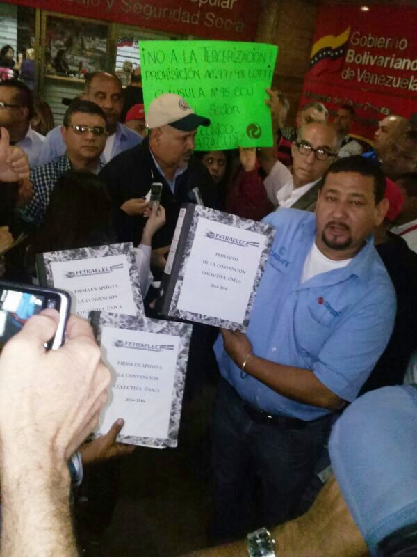 Caracas, 12 de mayo de 2014.- Los trabajadores eléctricos organizados a través de su Federación Eléctrica de Venezuela FETRAELEC que, a juicio de los trabajadores de CORPOELEC, es la organización más representativa y combativa a nivel nacional, liderizada por Ángel Navas y su equipo, el día viernes 09 De Mayo 2014 a las 10 am en la sede de MINTRAPPS sede en Plaza Caracas, acompañada por 38 0rganizaciones sindicales de un total de 46 afiliadas a la federación y con el respaldo de las firmas de los trabajadores de todo el país, consignaron en un alto multitudinario de las trabajadoras y los trabajadores su Proyecto de Convención Colectiva 2014-2016 así lo manifestaron los dirigentes sindicales de Corpoelec Región Capital: José Useche, Jaqueline Guillen, Eva Sánchez, Surella Medina, Cruz Sosa, Tibisay Somana, Johan Fernández, Juan Blanco, Guillermo Blanco.