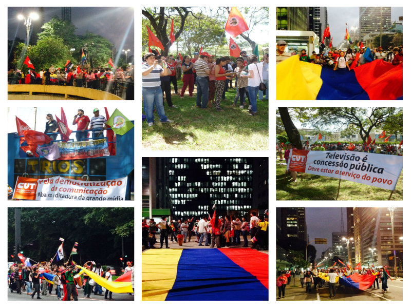 Representantes del Movimiento de Trabajadores del Campo, Marcha de Mujeres, Levante Popular de la Juventud, Movimiento de los Trabajadores Sin Tierra, Mujeres Campesinas, Central Única de Trabajadores, Comité Brasil Está con Chávez y sigue con Maduro, Foro Nacional para la Democratización de la Comunicación, y Marcha de Mujeres, entre otras organizaciones, se movilizaron a lo largo y ancho del territorio nacional y realizaron la toma simbólica de las sedes de la TV Red O Globo, la más influyente del país, en las capitales de São Paulo y Belo Horizonte y en el Distrito Federal.