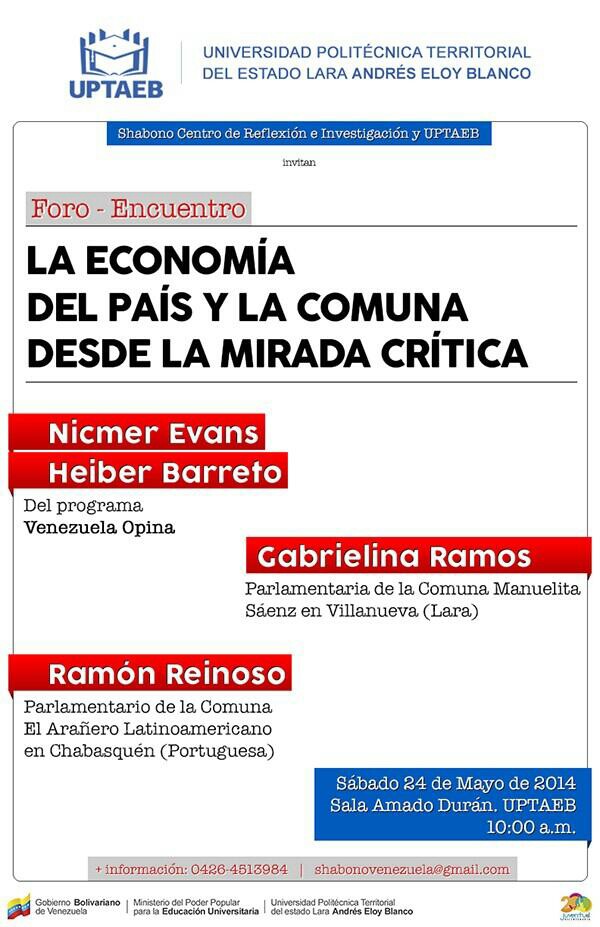 Convocado por el Colectivo "Shabono Centro de Reflexión e Investigación" y la Universidad Politécnica Territorial del Estado Lara Andrés Eloy Blanco, este sábado 24 de Mayo de 2014, se realizará el Foro-Encuentro: "La Economía del país y la comuna desde la mirada crítica."