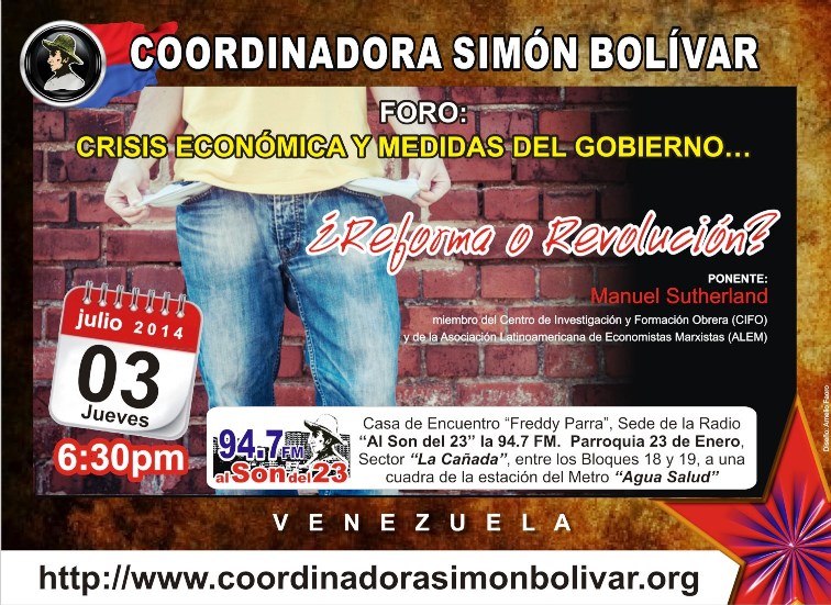 Como un aporte a la formación, concientización y organización popular revolucionaria, se invita al público en general a asistir, este jueves 03 de julio de 2014, a las 6:30 pm, a un foro denominado “Crisis Económica Y Medidas Del Gobierno… ¿Reforma O Revolución?”, con la participación en la calidad de ponente Manuel Sutherland, miembro del Centro de Investigación y Formación Obrera (CIFO) y de la Asociación Latinoamericana de Economistas Marxistas (ALEM).