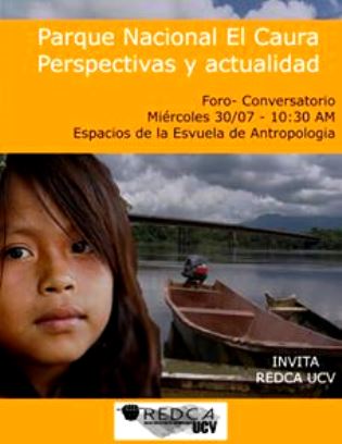 Invita a asistir al Foro-Conversatorio, Parque Nacional El Caura, perspectivas y actualidad, donde se debatirá sobre la situacion del Parque Nacional El Caura, su biodiversidad, la problematica indigena y la delimitacion territorial en la zona. En la Escuela de Antropologia-UCV, piso 2 salón de Usos Múltiples, miércoles 30 de Julio, 10:30 am