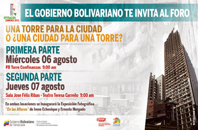 Caracas, agosto 6 - El Gobierno Bolivariano a través de la Oficina Presidencial de Planes y Proyectos Especiales invita al pueblo venezolano al foro: “Una torre para la ciudad o ¿una ciudad para una torre?” que se desarrollará los días miércoles 6 y jueves 7 de agosto, con el propósito de abrir el debate nacional acerca el destino de la torre Confinanzas, tras el desarrollo exitoso de las cinco fases de la Operación Zamora.