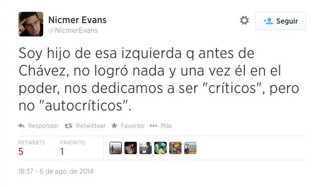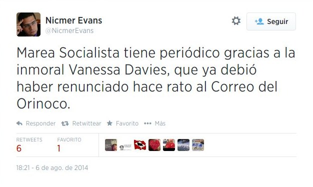 6 de agosto de 2014.- En horas de la tarde de hoy, intrusos informáticos tomaron control de la cuenta en Twitter de Nicmer Evans, politólogo chavista, miembro del Partido Socialista Unido de Venezuela (PSUV) y frecuente columnista de Aporrea, quien ha sido centro de controversias por sus posiciones críticas contra la cúpula del PSUV y contra algunas medidas del Ejecutivo Nacional.
