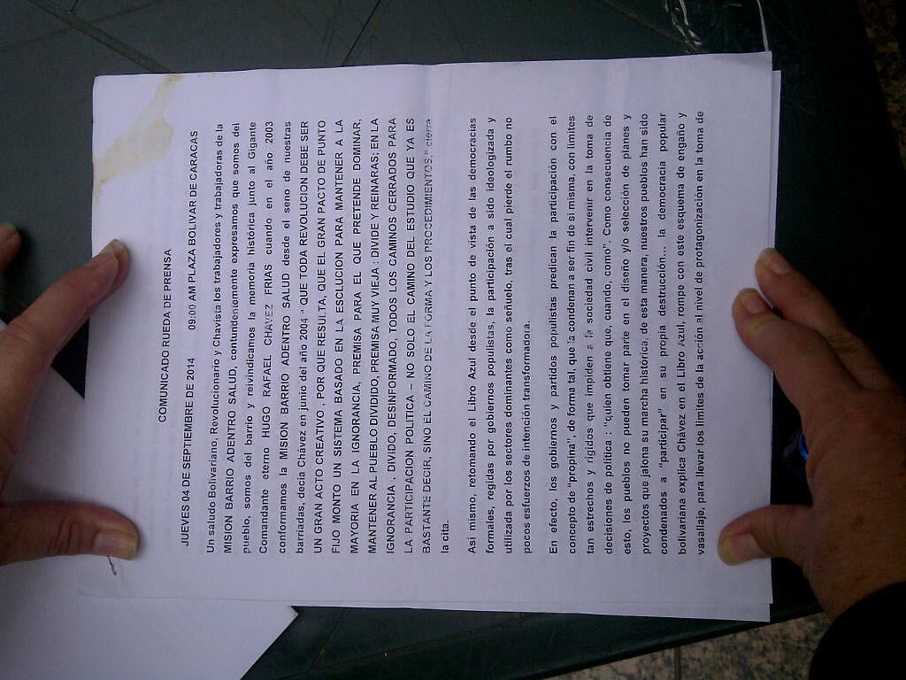 El día Jueves 04 de septiembre de 2014 a las 9am un número importante de trabajadores y trabajadoras de la misión Barrio adentro Salud se concentraron en las inmediaciones del GDC en la plaza Bolívar de Caracas para expresar su rechazo a las medidas tomadas por la Dra. Libia García quien forma parte del área de RRHH nivel central fundación barrio adentro.