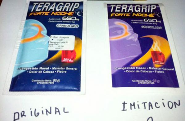 La falsificación del primero es fácilmente reconocible por el troquelado de la marca del producto en la tapa, además de presentar diferencias en diseño, material, acabado de etiqueta (tamaño y color de la letra) y calidad de impresión. El Teragrip, por su parte, es un sobre totalmente liso, sin la impresión del registro sanitario al costado, y diferencias en los números del registro impresos en la parte trasera del sobre.