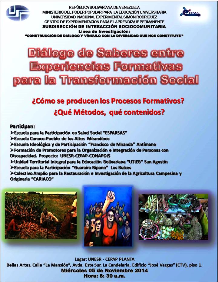 El Ministerio del Poder Popular para la Educación Universitaria, la Universidad Nacional Experimental Simón Rodríguez y el Centro de Experimentación para el Aprendizaje Permanente, Subdirección de Interacción Sociocomunitaria en el marco de la Línea de Investigación: “Construcción de Diálogo y Vínculo con la Diversidad que nos Constituye” invitan al "Diálogo de Saberes entre Experiencias Formativas para la Transformación Social": ¿Cómo se producen los Procesos Formativos?...¿Qué Métodos, qué contenidos?