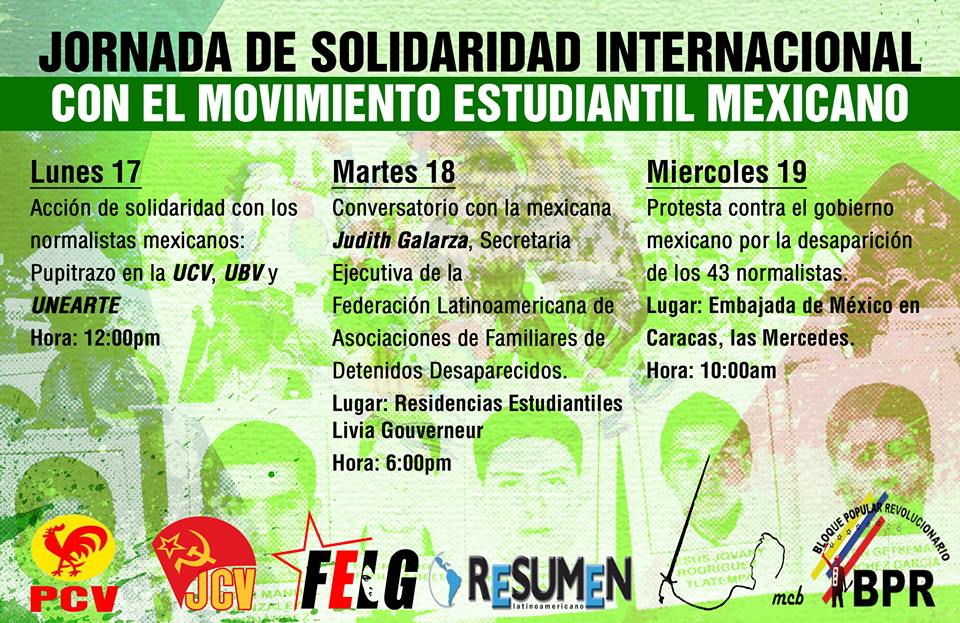 El Partido Comunista de Venezuela, Juventud Comunista de Venezuela, Frente Estudiantil Livia Gouverneur, Resumen Latinoamericano, Movimiento Continental Bolivariano, Coordinadora Simón Bolívar y el Bloque Popular Revolucionario, convocan este miércoles 19 de Noviembre a participar en una jornada de protesta frente a la embajada de México repudiando la desaparición de los 43 estudiantes normalistas desaparecidos y el ejercicio constante de terrorismo de estado y represión contra el movimiento popular revolucionario!