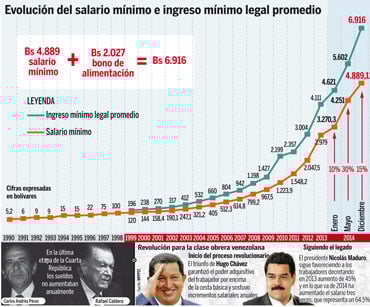 Asimismo, el ingreso mínimo legal promedio queda en 6.916,00 bolívares, según el Cuadro Evolución Salario Mínimo Legal Promedio 1990-2014.