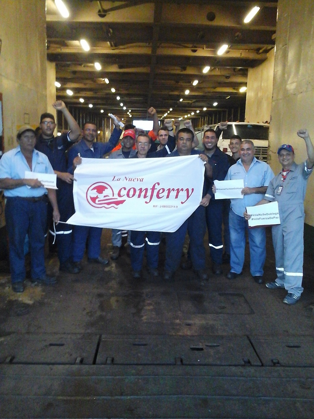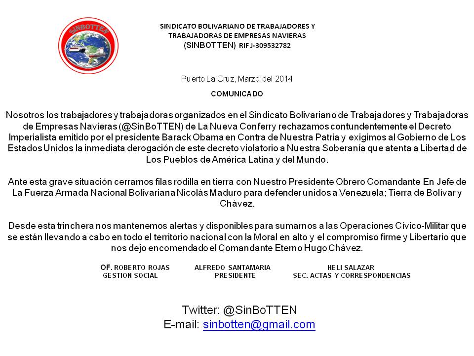 Nosotros los trabajadores y trabajadoras organizados en el Sindicato Bolivariano de Trabajadores y Trabajadoras de Empresas Navieras (@SinBoTTEN) de La Nueva Conferry rechazamos contundentemente el Decreto Imperialista emitido por el presidente Barack Obama en Contra de Nuestra Patria y exigimos al Gobierno de Los Estados Unidos la inmediata derogación de este decreto violatorio a Nuestra Soberanía que atenta a Libertad de Los Pueblos de América Latina y del Mundo.