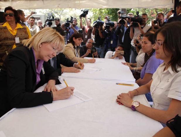 (Caracas, 24 de marzo de 2015) Acompañada por el Vicefiscal General, directores y demás trabajadores del Ministerio Público, la fiscal general de la República, Luisa Ortega Díaz, firmó este martes 24 de marzo contra el decreto del presidente de los Estados Unidos, Barack Obama, el cual sanciona a siete funcionarios venezolanos, entre ellos, una fiscal de la institución, a quienes señala de presuntamente violar los derechos humanos en Venezuela.