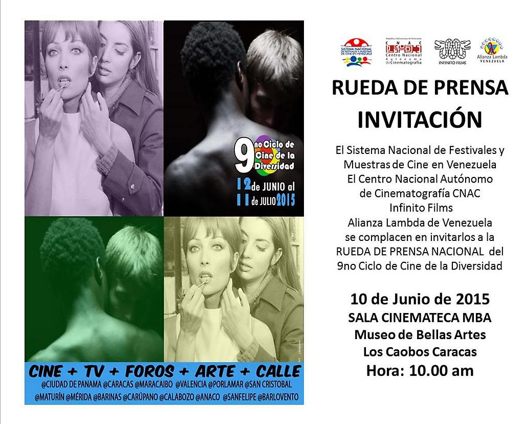 8 de junio de 2015.- El Sistema Nacional de Festivales y Muestras de Cine en Venezuela, El Centro Nacional Autónomo de Cinematografía CNAC, Infinito Films, Alianza Lambda de Venezuela se complacen en invitarlos a la RUEDA DE PRENSA NACIONAL del 9no Ciclo de Cine de la Diversidad