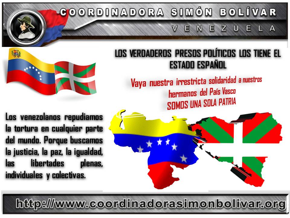 Ante las alarmantes noticias que nos llegan desde nuestro querido y amigo País Vasco, donde son una constante la tortura, el aislamiento indefinido a los presos, la inasistencia sanitaria en prisión, la prohibición de las comunicaciones, la dispersión, el alejamiento de los presos de sus familias y lugares de origen, la cadena perpetua, la detención de los abogados de confianza negando de esta forma el derecho a la defensa, las palizas, malos tratos y un largo etcétera de denuncias de prácticas inhumanas y degradantes por parte del Estado Español, la Coordinadora Simón Bolívar junto al Diputado Juan Contreras ha concertado los servicios del abogado Adán Navas Nieves para constatar la situación de los Presos Políticos independentistas vascos.