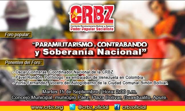 La Corriente Revolucionaria Bolívar y Zamora (CRBZ); movimiento social venezolano, chavista y revolucionario; se complace en invitarlo al Foros CRBZ: "Paramilitarismo, contrabando y soberanía nacional". El mismo se realizará el próximo martes 15 de septiembre en el Concejo Municipal, Plaza Bolívar, municipio Páez, Guasdualito en el estado Apure, a partir de las 02:00 p.m.