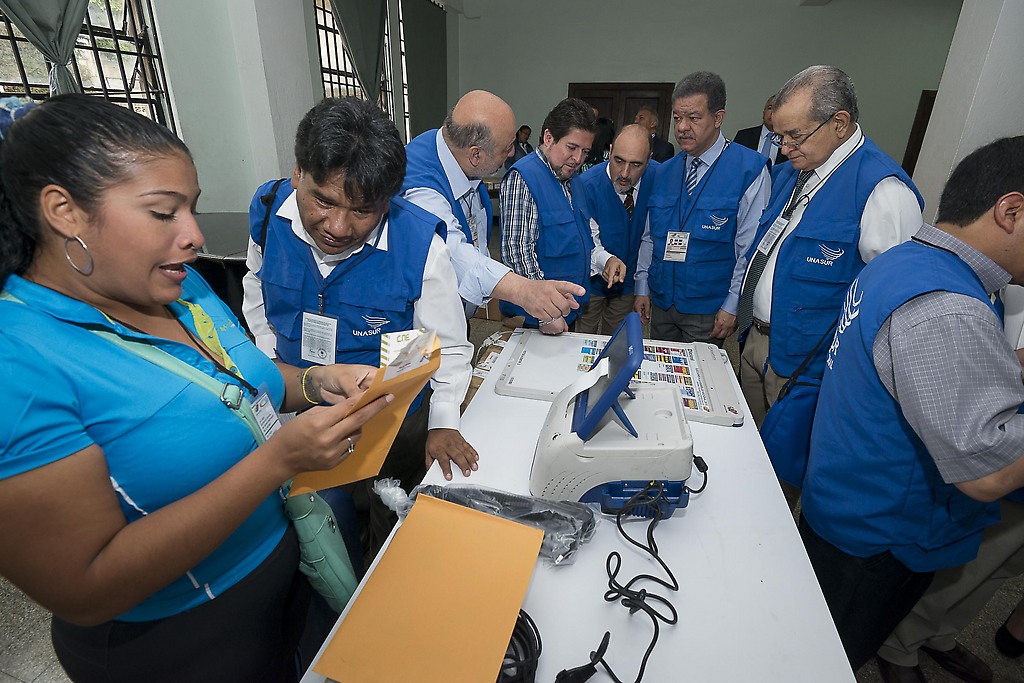 Los integrantes de la UNASUR compartieron esta experiencia junto a los que intervienen en el proceso electoral y se mostraron interesados en esta fase de la jornada.