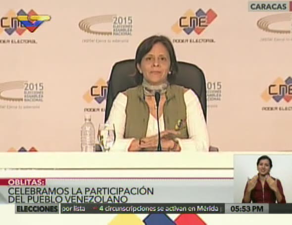 Caracas, diciembre 6 - Las mesas de votación permanecerán abiertas mientras que haya electores para que todos puedan ejercer su derecho al voto, informó este domingo la vicepresidenta del Consejo Nacional Electoral (CNE), Sandra Oblitas, en declaraciones a medios de comunicación. La declaración se da ante pronunciamientos de la oposición en torno a cerrar las meses a las 6 de la tarde. La rectora Oblitas señaló que las mesas estarán abiertas hasta las 7 de la noche o hasta que haya votantes en las colas