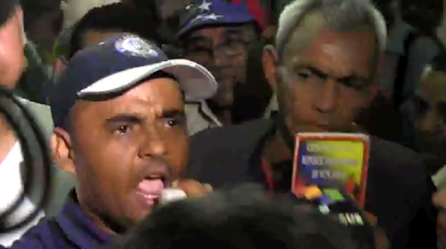 El grupo vociferaba consignas como si la rueda de prensa fuese de la derecha y no de uno de los sectores de la revolución bolivariana, que además fue muy cercano al Comandante Chávez, hasta último momento. Al ingresar en el Hotel El Conde, en la entrada, se escuchó comentar a uno de los integrantes del grupo, por confusión o por engaño, "adentro está Miquelena", que traicionó a Chávez con el golpe del 11 de Abril de 2002. Luego penetraron por la fuerza en la sala, haciendo ruido con la sirena de un megáfono.