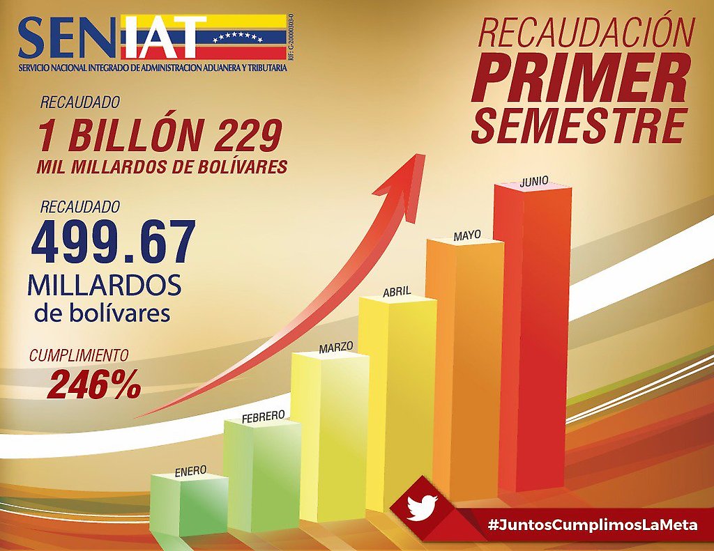 Así lo indicó a través de su cuenta de Twitter @jdavidcabello donde escribió: “SENIAT recaudó 1 billón 229 mil millones de Bs. en el 1er Semestre…#JuntosCumplimosLaMeta @NicolasMaduro”