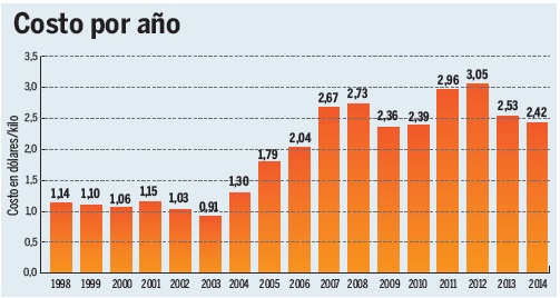 Así se registran compras de 11 mil 600 millones de kilos pero con un costo general de más de 15 mil millones de dólares, con lo que el precio promedio por kilo se dispara en 2004 a 1,30 dólares.
