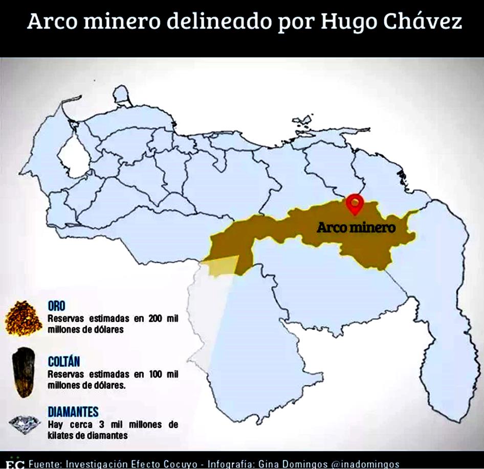 El Arco consta de cuatro bloques para la exploración y explotación: el área 1, de 24.717 Km2 de extensión, que tiene como límite más occidental el Río Cuchivero, donde predomina el coltán y el diamante; el área 2, de 17.246 Km2, donde abundan los minerales no metálicos y el oro aluvional; el área 3, que empieza en el Río Aro hasta el límite este del Arco Minero, con 29.730 Km2 donde predominan el hierro y la bauxita; y el área 4, que abarca el área conocida como Sierra de Imataca.