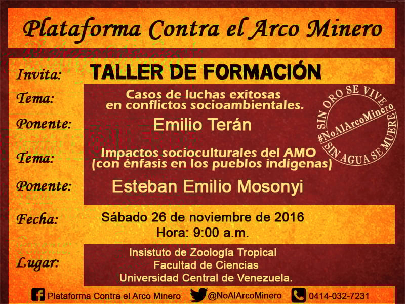 Como parte de las actividades llevadas a cabo por la Plataforma Contra el Arco Minero del Orinoco, este sábado 26 de noviembre a partir de las 9 de la mañana se estará desarrollando la 4ta Jornada de Formación con la participación del investigador Emiliano Montovani y el profesor y defensor de los derechos indígenas Estaban Mosonyi.
