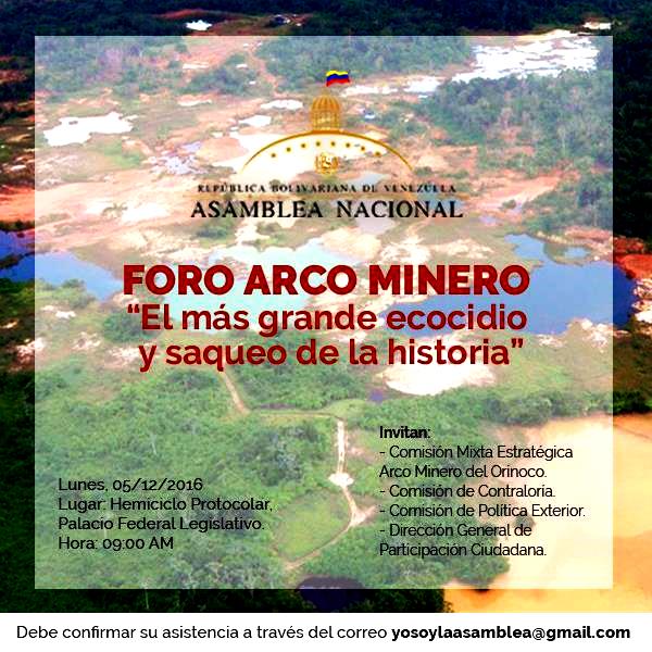 La Comisión Mixta Estratégica del "Arco Minero del Orinoco de la Asamblea Nacional conformada por las Comisiones de Contraloría, Política Exterior y la Dirección General de Participación Ciudadana extiende una invitación al público en general al Foro Arco Minero: "El más grande ecocidio y saqueo de la historia", el cual se llevará a efecto el día 5 de diciembre de 2016, a las 9:00 am, en el Hemiciclo Protocolar del Palacio Federal Legislativo (Asamblea Nacional), cercano a la Estación del Metro Capitolio.