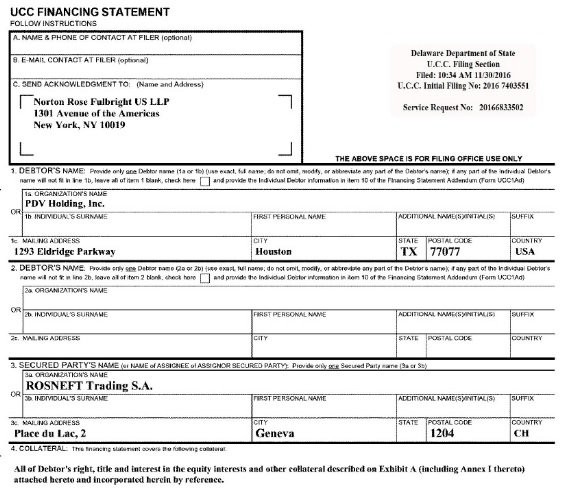 La hipoteca quedó en evidencia por una declaración del Código Comercial Uniforme de Delaware (UCC en inglés) a favor de Rosneft Trading SA por PDV Holding Inc que fue descubierta por Redd Intelligence quien difundió la noticia.