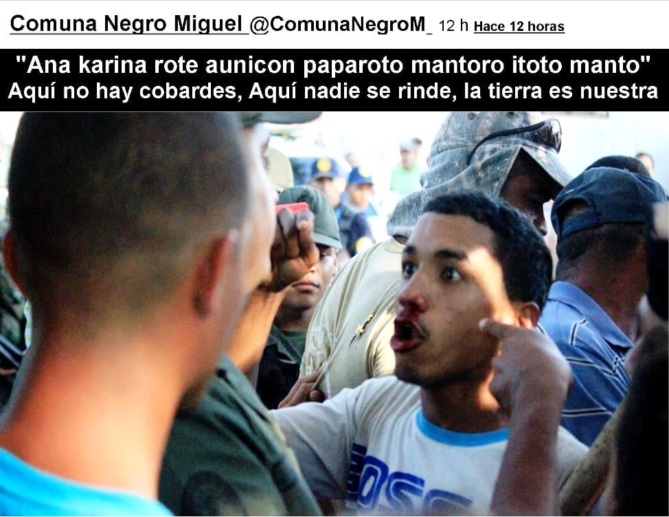 En la mañana del día 12 de enero del año en curso, agentes de la Policía del estado Yaracuy, conjuntamente con funcionarios de la Guardia Nacional Bolivariana, intentaron por medio de la violencia reaccionaria desalojarlos para restituirle el dominio sobre la hacienda al latifundista Capitán Luis Plaza, Ex –alcalde del Municipio Jiménez. Las comuneras y los comuneros resistieron la agresión y la represión policial y militar, al punto que aún permanecen en la hacienda ocupada y ya han desarrollado las correspondientes labores de organización, a los fines de la reactivación de la producción. Las y los integrantes de la Comuna Negro Miguel, son testimonio vivo que el espíritu y lucha del General Ezequiel Zamora continúa combatiendo en el llano Venezolano. VIVA LA EMPRESA DE PRODUCCIÓN SOCIAL BICENTENARIO DE ZAMORA.