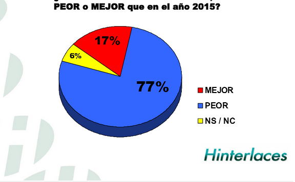 El estudio del 24 de enero basado en 1.580 entrevistas detalla que 77% de la población considera que económicamente en el 2016 le fue “peor” que en el 2015 y 17% asegura que le fue “mejor”. Solo 6% NS/NC.