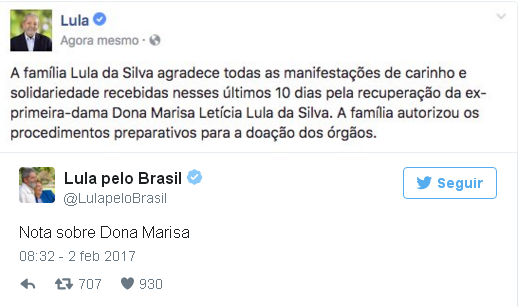 "Quiero anunciar el fallecimiento de la esposa del expresidente Luiz Inácio Lula da Silva, quien nos ha autorizado para ello, y pedir un minuto de silencio en nombre de quien fue la primera dama de Brasil" entre 2003 y 2010, dijo la diputada.