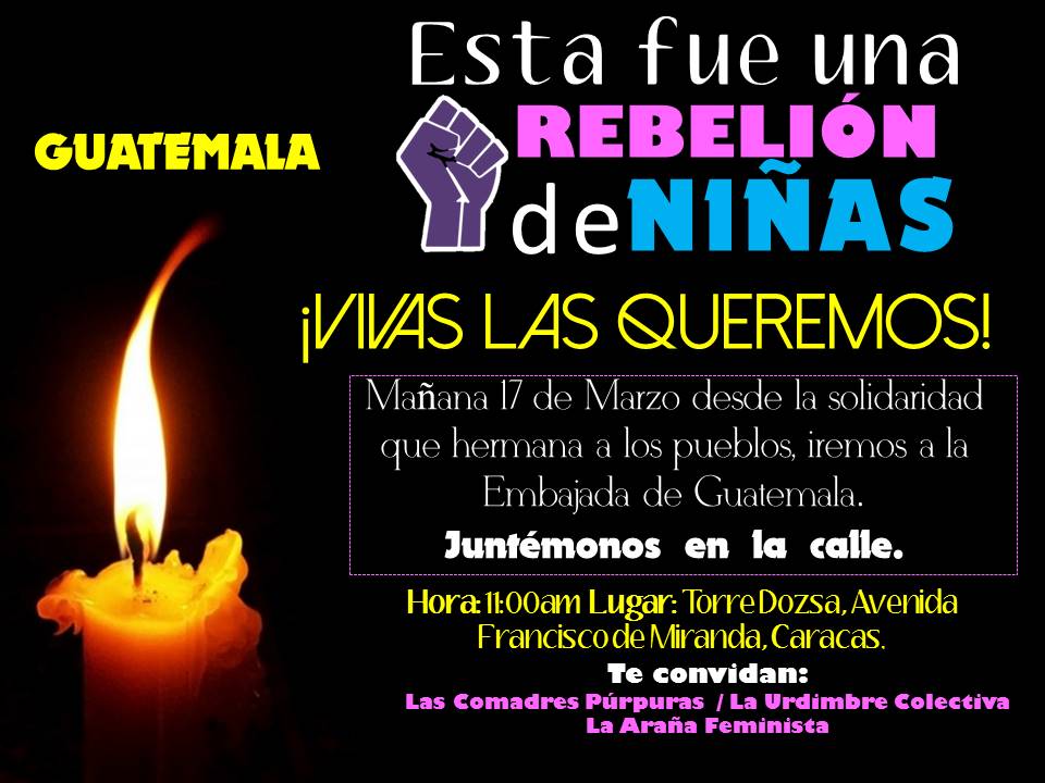 16/03.- A través de las redes sociales diversos organizaciones feministas de Venezuela se han pronunciado en torno a la lamentable tragedia ocurrida el pasado 8 de marzo en Guatemala, en la cual 40 niñas murieron calcinadas en una casa hogar. Las denuncias de las condiciones infrahumanas en las que las niñas vivian en ese sitio se iniciaron el año pasado, sin embargo el estado guatemalteco no tomó ninguna acción. Este crimen de estado ha generado indignación y movilización en varios paises y desde Venezuela también más voces su suman a la rabia mundial. A continuación reproducimos el comunicado del colectivo feminista ¨Las Comadres Purpuras¨ en el cual se refuerza la convocatoria para este viernes 17 de marzo en la embajada de Guatemala en Venezuela, ubicado en la Av. Francisco de Miranda (vea el mapa de ubicación)