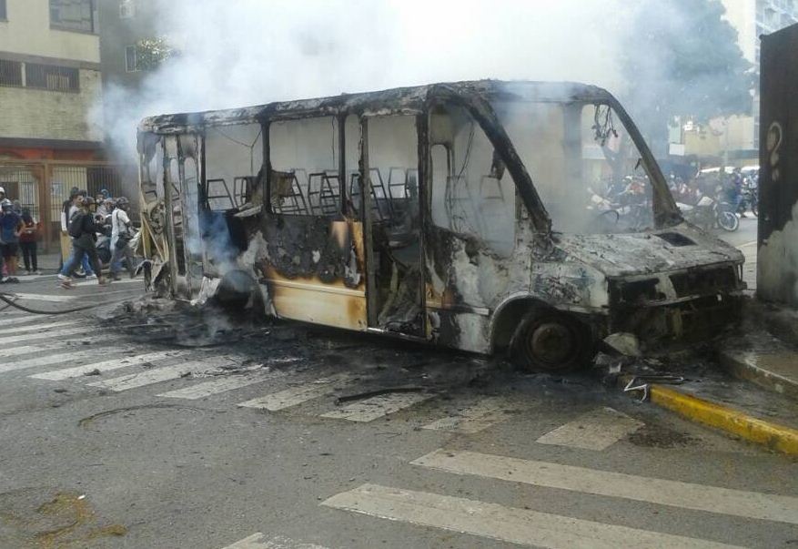 13 de mayo de 2017.“Delincuentes contratados por la oposición de derecha terrorista incendian una unidad de transporte público en la Av. Francisco de Miranda, Altamira”, informó el ministro del Poder Popular para Relaciones Interiores, Justicia y Paz, Mayor General Néstor Luis Reverol, desde su cuenta en la red social twitter @NestorReverol.