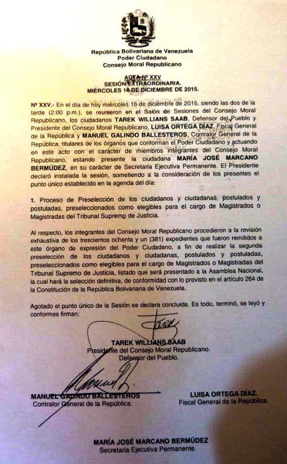 Ortega Díaz introdujo la solicitud porque, a su juicio, los magistrados pudieran estar incursos en el delito de conspiración contra la forma republicana, previsto en el artículo 132 del Código Penal. “Ellos son: Juan José Mendoza, Arcadio Delgado, Carmen Zuleta, Calixto Ortega, Luis Damiani, Lourdes Suárez y los suplentes Federico Fuenmayor y René De Graves”.