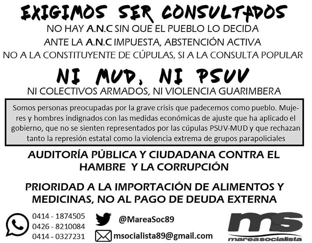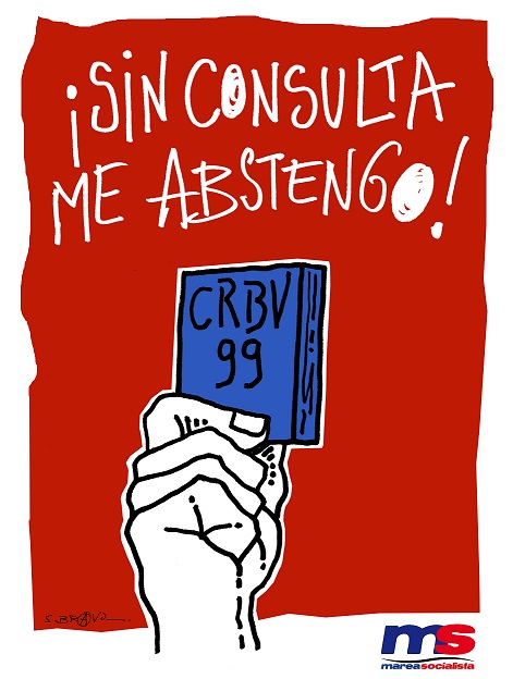 20/07.- El movimiento político Marea Socialista iniciará una campaña por medios de comunicación, redes sociales, volanteos y difusión en la calle para promover la abstención activa en el proceso electoral previsto el 30 de julio en el que se elegiran los representantes para la Asamblea Nacional Constituyente. La organización politica argumenta que la ausencia de referendúm consultivo previo a la elección de los constituyentes es una violación a la Constitución a la democracia participativa y protagónica que ella contempla. A continuación reproducimos el contenido de la campaña por la Abstención Activa que promueve Marea Socialista: