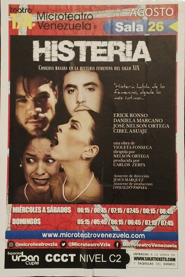 Caracas, 11 de agosto de 2017.- Una producción de Viart Producciones y escrita por la venezolana Violeta Fonseca, la pieza Histeria narra las visicitudes vividas por las mujeres a finales del siglo XIX, en el que la histeria se convirtió en una plaga entre las féminas. Esta supuesta enfermedad ocasionaba que las mujeres padecieran de sofocones, irritabilidad, asfixia, ansiedad, fantasías sexules y cualquier comportamiento extraño.