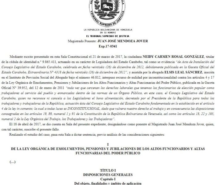 La decisión se produjo en respuesta a una demanda de nulidad que interpuso la legisladora del estado Carabobo Neidy Carmen Rosal González, quien impugnó la ley porque "cercena los derechos laborales de los funcionarios de elección popular", refiere la sentencia.