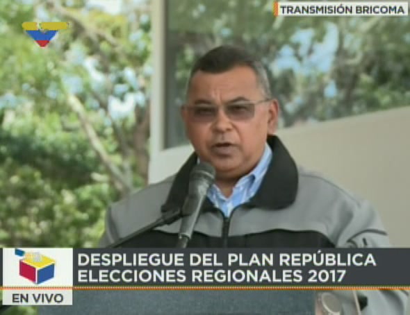 Caracas, 10 de octubre de 2017.- Un total de 143 mil funcionarios de diferentes cuerpos policiales garantizarán la seguridad del pueblo en los comicios regionales que se celebrará el 15 de octubre en el país, anunció el ministro del Poder Popular para las Relaciones Interiores, Justicia y Paz M/G Néstor Reverol.