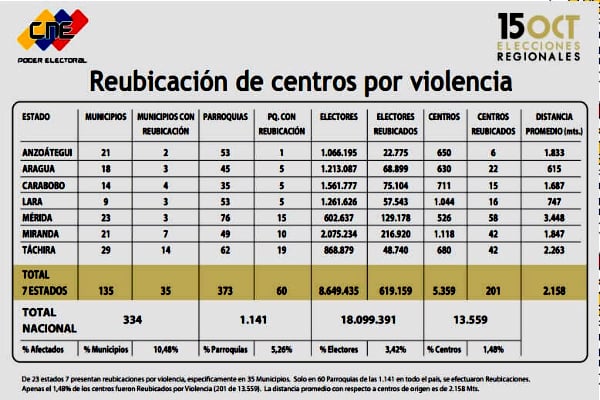 Estos centros de votación, ubicados en los estados Aragua, Anzoátegui, Carabobo, Lara, Mérida, Miranda y Táchira, involucran a 3,42% del total de los electores y las electoras habilitadas para votar en estas eleciones. Los recintos electorales reubicados en estos siete estados están ubicados en 60 de las 1.141 parroquias del país.