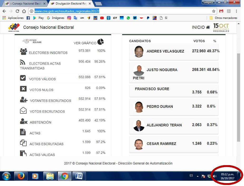 Para el momento en el que Velazquez daba esas declaraciones poco más del 97% de las actas ya habían sido escrutadas, como lo refleja esta captura de pantalla realizada a la hora indicada y difundida a través del twitter de Andrés Velazquez, página eliminada posteriormente: