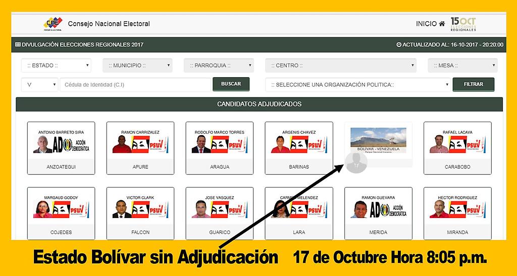 El portal oficial del Consejo Nacional Electoral (CNE) publicó y en cuestión de horas eliminó del portal, resultados en Bolívar que confirmaban la victoria de la oposición en este estado.