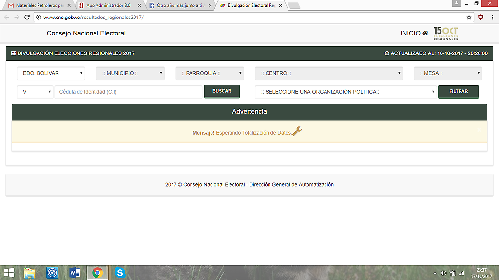 Otro usuario, desde el anonimato, exclamaba con vehemencia “Exigimos al CNE que publique los resultados oficiales. El caso del estado Bolívar presenta demasiadas incongruencias. En Miranda y Zulia participaron más de 1 millón de personas en cada entidad. En Anzoategui, la diferencia entre los principales contrincantes fue menor al 4%. Los resultados de todos los estados se anunciaron a la misma hora del 15 de octubre. ¿Por qué tanta espera para darlos resultados?. No existe justificación. Aquí hay una clara manipulación de resultados y negociación política en las grandes esferas.”
