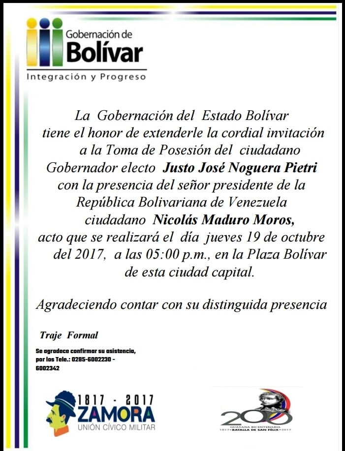 Usuarios de aporrea del Estado Bolívar han hecho llegar una denuncia común respecto a los comicios electorales en dicha entidad. En este caso se refieren a la difusión por redes sociales y grupos de whatsapp de una invitación (con el sello de la gobernación) a la juramentación del candidato Justo José Noguera Pietri, a pesar de que aún el CNE no haya publicado resultados oficiales de los comicios. El documento expresa que en la toma de posesión, a realizarse este jueves 19 de octubre a las 5pm en la plaza bolívar de la ciudad capital, haría presencia el presidente de la república Nicolás Maduro.