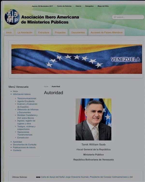 9 noviembre, 2017.- La Asociación Iberoamericana de Ministerios Públicos ha reconocido a Tarek William Saab como Fiscal General de Venezuela y ha publicado su nombre y fotografía como la autoridad de ese organismo en la nación suramericana.