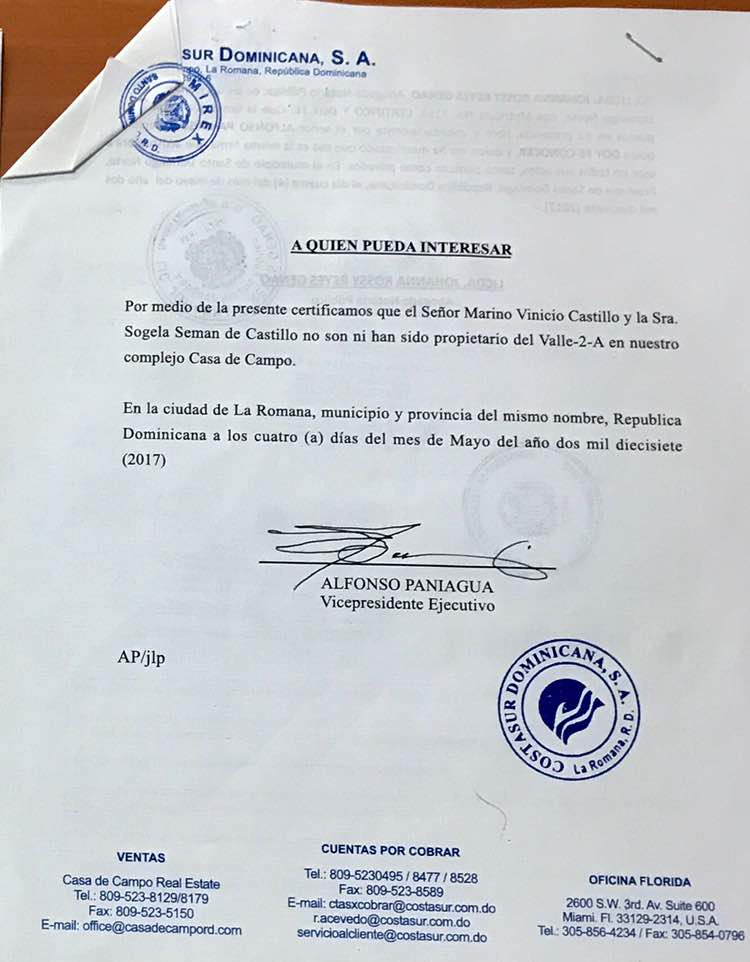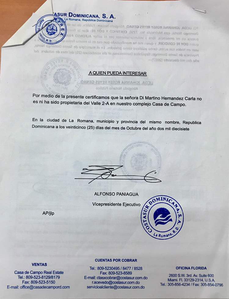Complementariamente se tuvo acceso a una constancia emitida por el vicepresidente de la compañía administradora del complejo Casa de Campo, Costasur Dominicana, que certifica que Carla Di Martino “no es ni ha sido propietaria del Valle 2-A”.