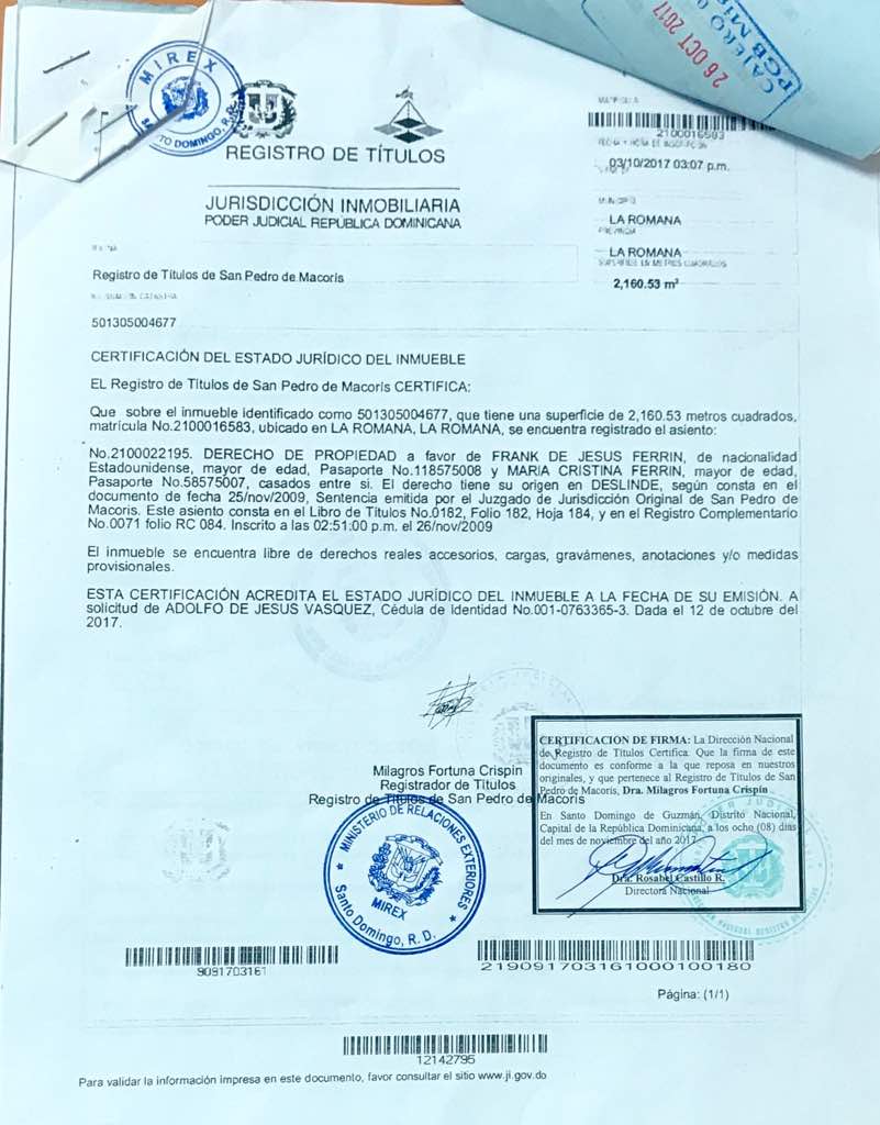 Sin embargo el título de propiedad original, apostillado debidamente por el Ministerio de Relaciones Exteriores dominicano, indica que el inmueble Valle 2-A, es propiedad del ciudadano estadounidense Frank de Jesús Ferrín y de su esposa María Cristina Ferrín, y que el origen de tal derecho es un deslinde dictado por el juzgado de San Pedro de Macoris el 25 de noviembre de 2009.