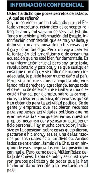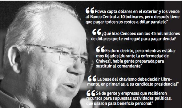 "Nadie cree el cuento de que Pdvsa sea la única entidad afectada por el fenómeno deplorable de la corrupción. He insistido en preguntar, por ejemplo, qué hizo Cencoex con los 45 mil millones de dólares que -durante mi último año al frente de Pdvsa- le entregué para pagar una deuda. Algo que nos ha desangrado –y que es el origen de todas las corruptelas- es el diferencial cambiario. Ha habido segmentos de poder que me atacaron por mis propuestas en el área económica y con las cuales quería poner punto final a esas irregularidades.